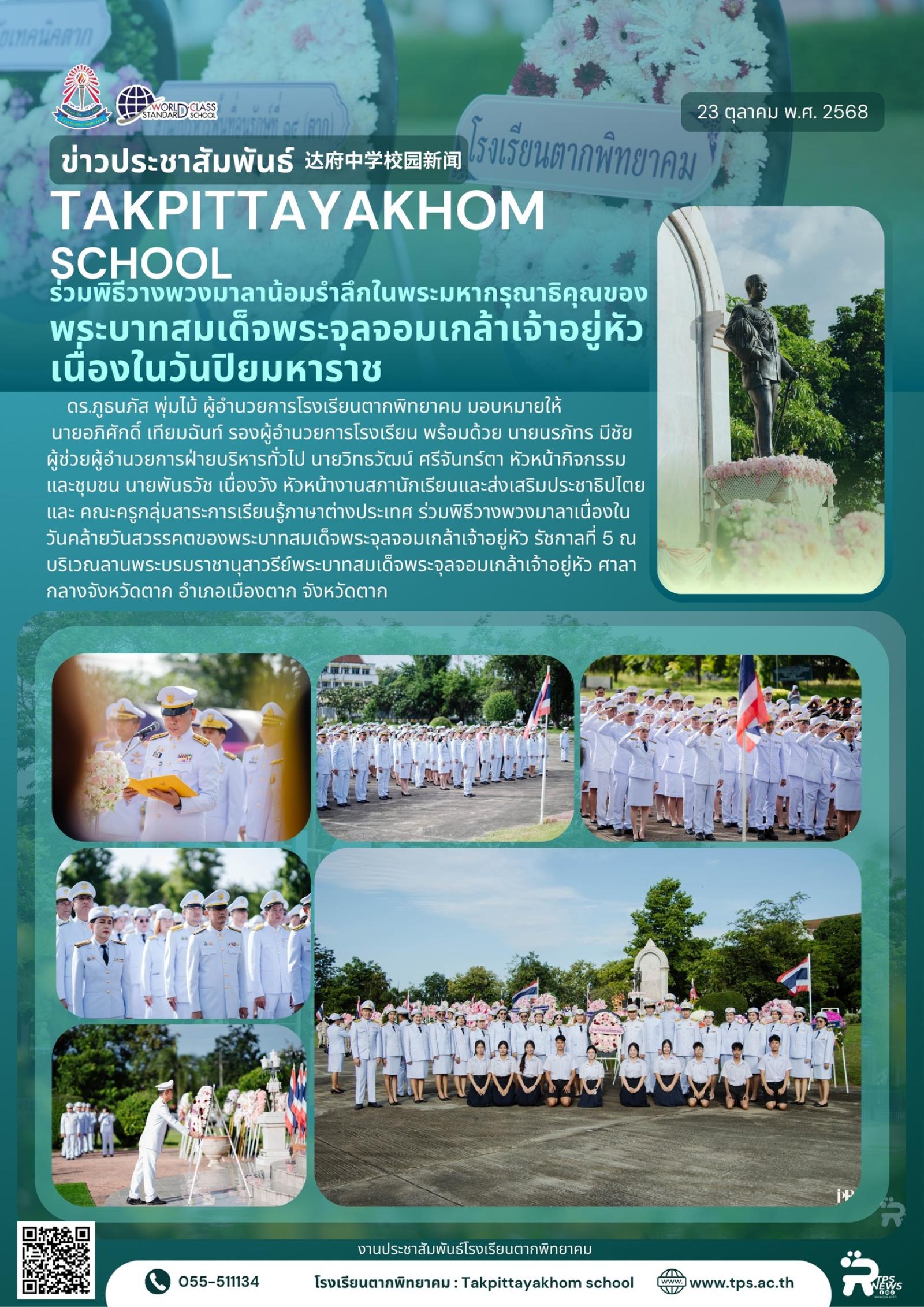 นายอภิศักดิ์ เทียมฉันท์ รองผู้อำนวยการโรงเรียน พร้อมด้วย นายนรภัทร มีชัย ผู้ช่วยผู้อำนวยการฝ่ายบริหารทั่วไป นายวิทธวัฒน์ ศรีจันทร์ตา หัวหน้ากิจกรรมและชุมชน นายพันธวัช เนื่องวัง หัวหน้างานสภานักเรียนและส่งเสริมประชาธิปไตย และ คณะครูกลุ่มสาระการเรียนรู้ภาษาต่างประเทศ ร่วมพิธีวางพวงมาลาเนื่องในวันคล้ายวันสวรรคตของพระบาทสมเด็จพระจุลจอมเกล้าเจ้าอยู่หัว รัชกาลที่ 5 ณ บริเวณลานพระบรมราชานุสาวรีย์พระบาทสมเด็จพระจุลจอมเกล้าเจ้าอยู่หัว ศาลากลางจังหวัดตาก อำเภอเมืองตาก จังหวัดตาก