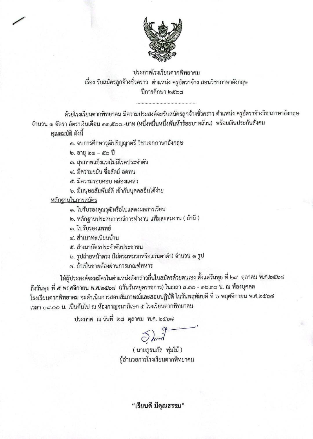 ด้วยโรงเรียนตากพิทยาคม มีความประสงค์จะรับสมัครลูกจ้างชั่วคราว ตำแหน่ง ครูอัตราจ้างวิชาภาษาอังกฤษ จำนวน ๑ อัตรา อัตราเงินเดือน ๑๑,๕๐๐.-บาท (หนึ่งหมื่นหนึ่งพันห้าร้อยบาทถ้วน) พร้อมเงินประกันสังคม