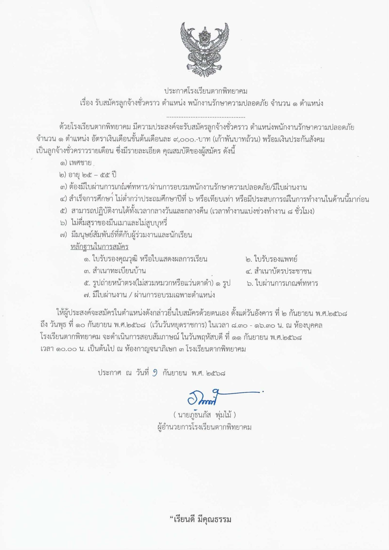 รับสมัครลูกจ้างชั่วคราว ตำแหน่ง พนักงานรักษาความปลอดภัย จำนวน ๑ ตำแหน่ง