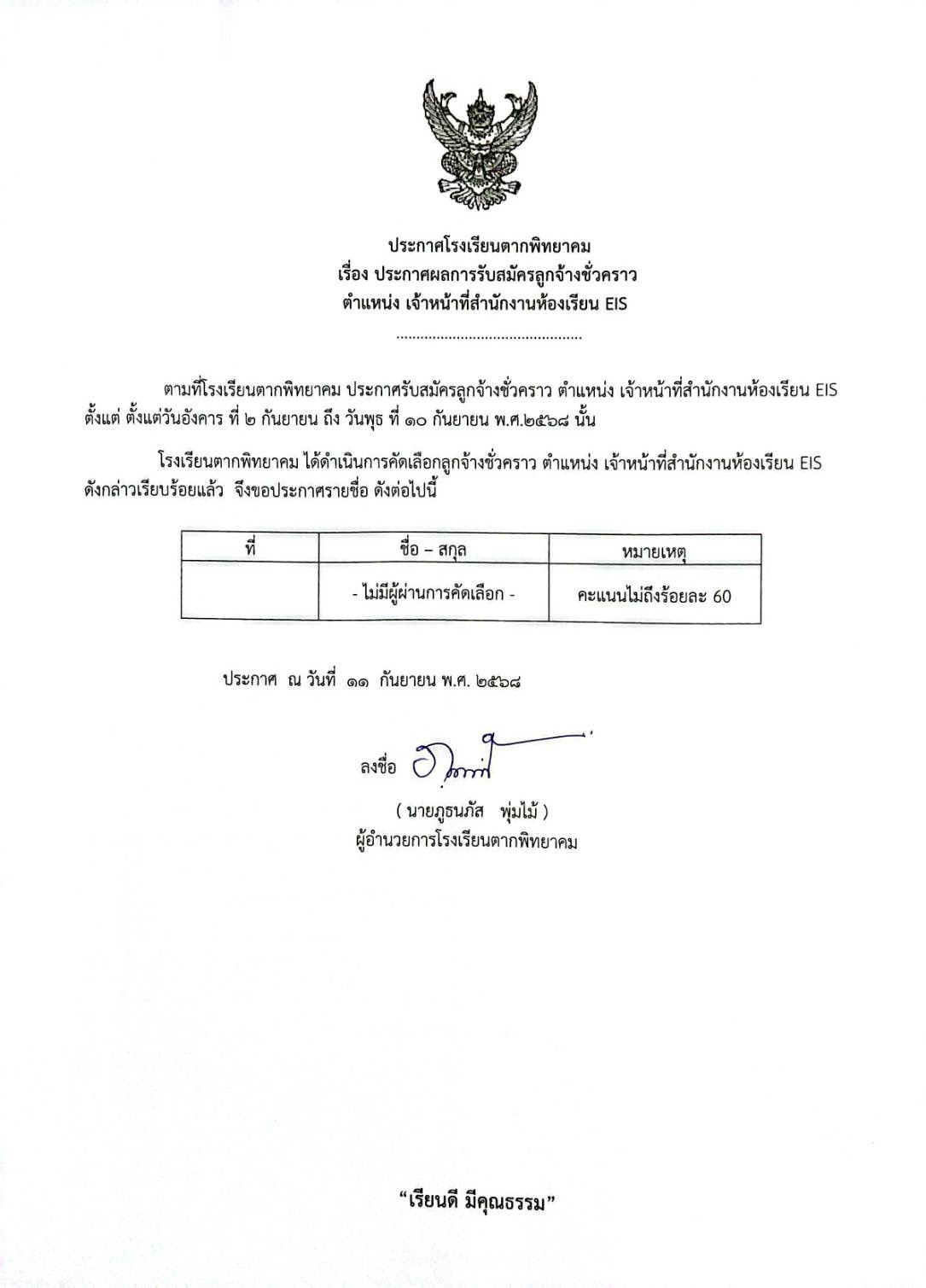 ประกาศผลการรับสมัครลูกจ้างชั่วคราวตำแหน่ง เจ้าหน้าที่สำนักงานห้องเรียน EIS