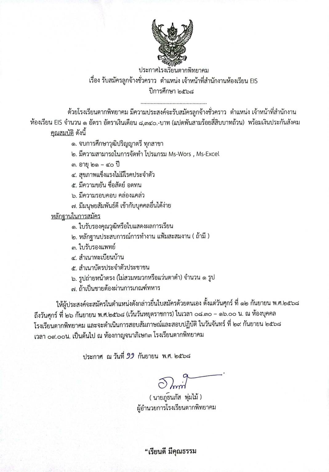 โรงเรียนตากพิทยาคมประกาศรับสมัครลูกจ้างชั่วคราว ตำแหน่งเจ้าหน้าที่ห้องเรียน EIS จำนวน ๑ ตำแหน่ง อัตราเงินเดือนเดือนละ ๘,๓๔๐.-บาท พร้อมเงินประกันสังคมเป็นลูกจ้างชั่วคราวรายเดือน ผู้สนใจสมัครยื่นใบสมัครด้วยตนเองตั้งแต่วันนี้จนถึงวันศุกร์ที่ ๒๖ กันยายน ๒๕๖๘ ณ ห้องบุคคลโรงเรียนตากพิทยาคม ซึ่งก่อนสมัครอ่านรายละเอียด คุณสมบัติของผู้สมัคร ดังรูปภาพที่แนบมานี้