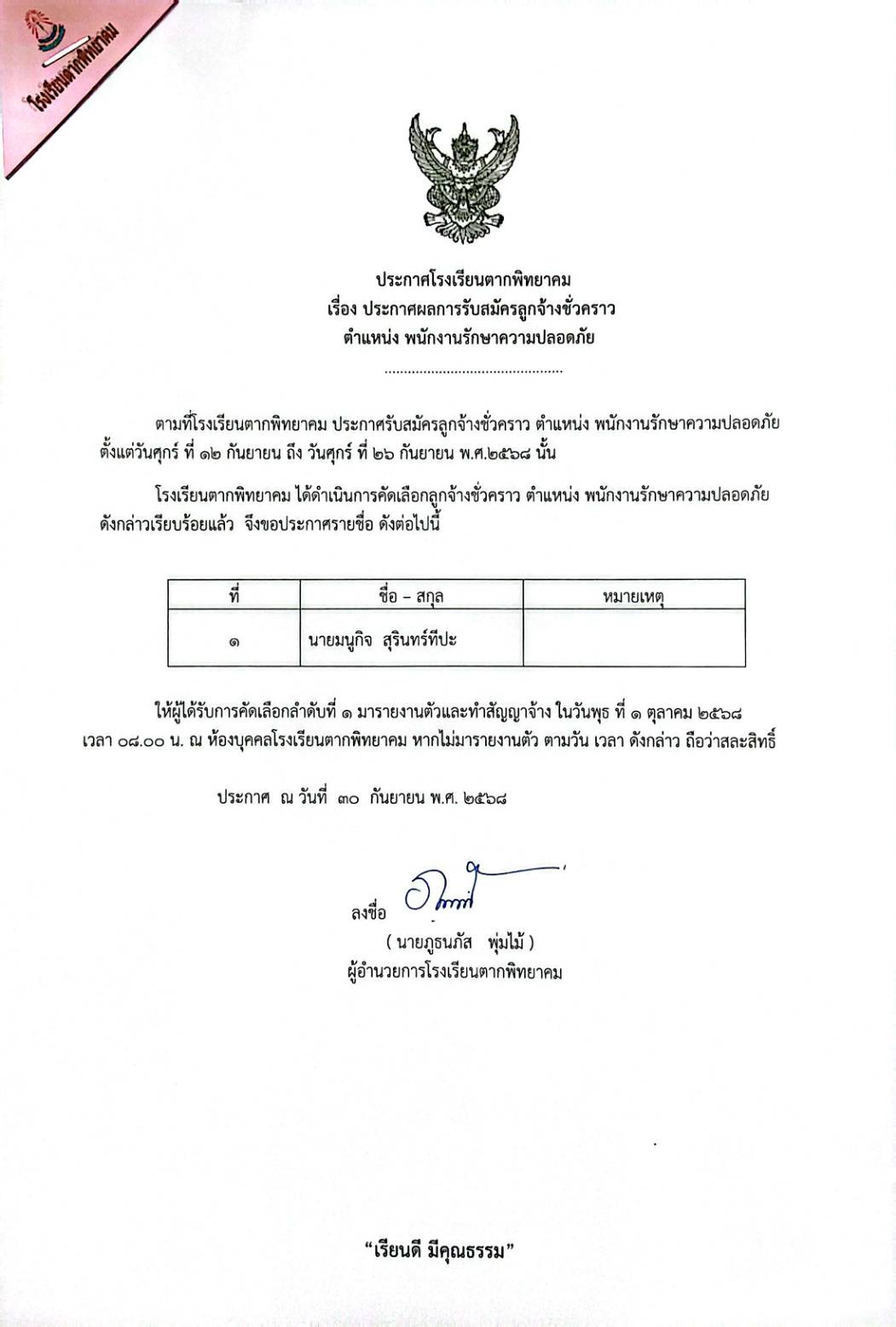 ให้ผู้ได้รับการคัดเลือกลำดับที่๑ มารายงานตัวและทำสัญญาจ้าง ในวันพุธ ที่ ๑ ตุลาคม ๒๕๖๘เวลา๐๘.๐๐ น. ณ ห้องบุคคลโรงเรียนตากพิทยาคม หากไม่มารายงานตัว ตามวัน เวลา ดังกล่าว ถือว่าสละสิทธิ์