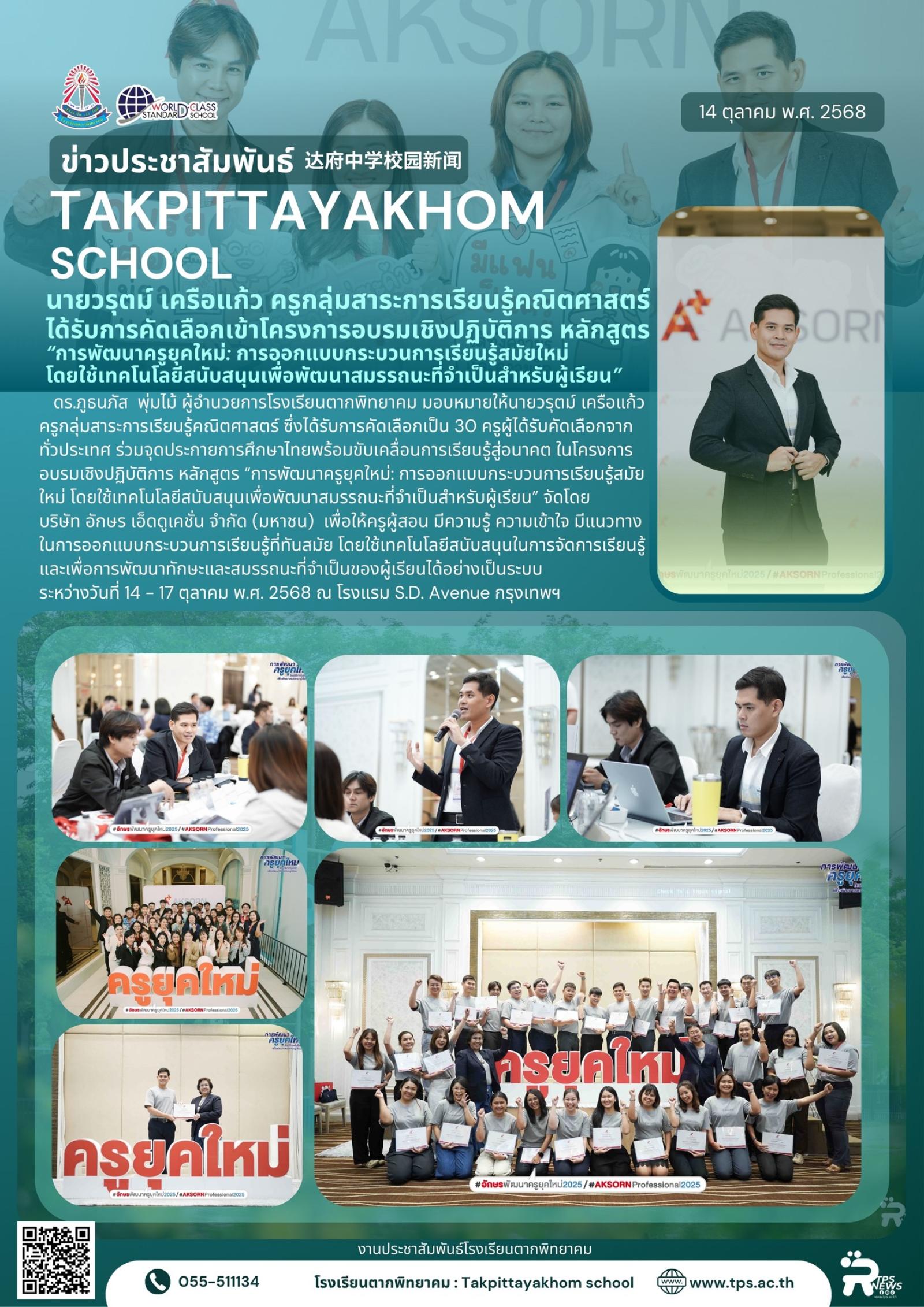 วันที่ 14 ตุลาคม พ.ศ. 2568 ดร.ภูธนภัส พุ่มไม้ ผู้อำนวยการโรงเรียนตากพิทยาคม มอบหมายให้นายวรุตม์ เครือแก้ว ครูกลุ่มสาระการเรียนรู้คณิตศาสตร์ ซึ่งได้รับการคัดเลือกเป็น 30 ครูผู้ได้รับคัดเลือกจากทั่วประเทศ ร่วมจุดประกายการศึกษาไทยพร้อมขับเคลื่อนการเรียนรู้สู่อนาคต ในโครงการอบรมเชิงปฏิบัติการ หลักสูตร “การพัฒนาครูยุคใหม่: การออกแบบกระบวนการเรียนรู้สมัยใหม่ โดยใช้เทคโนโลยีสนับสนุนเพื่อพัฒนาสมรรถนะที่จำเป็นสำหรับผู้เรียน” จัดโดยบริษัท อักษร เอ็ดดูเคชั่น จำกัด (มหาชน) เพื่อให้ครูผู้สอน มีความรู้ ความเข้าใจ มีแนวทางในการออกแบบกระบวนการเรียนรู้ที่ทันสมัย โดยใช้เทคโนโลยีสนับสนุนในการจัดการเรียนรู้ และเพื่อการพัฒนาทักษะและสมรรถนะที่จำเป็นของผู้เรียนได้อย่างเป็นระบบ ระหว่างวันที่ 14 - 17 ตุลาคม พ.ศ. 2568 ณ โรงแรม S.D. Avenue กรุงเทพฯ