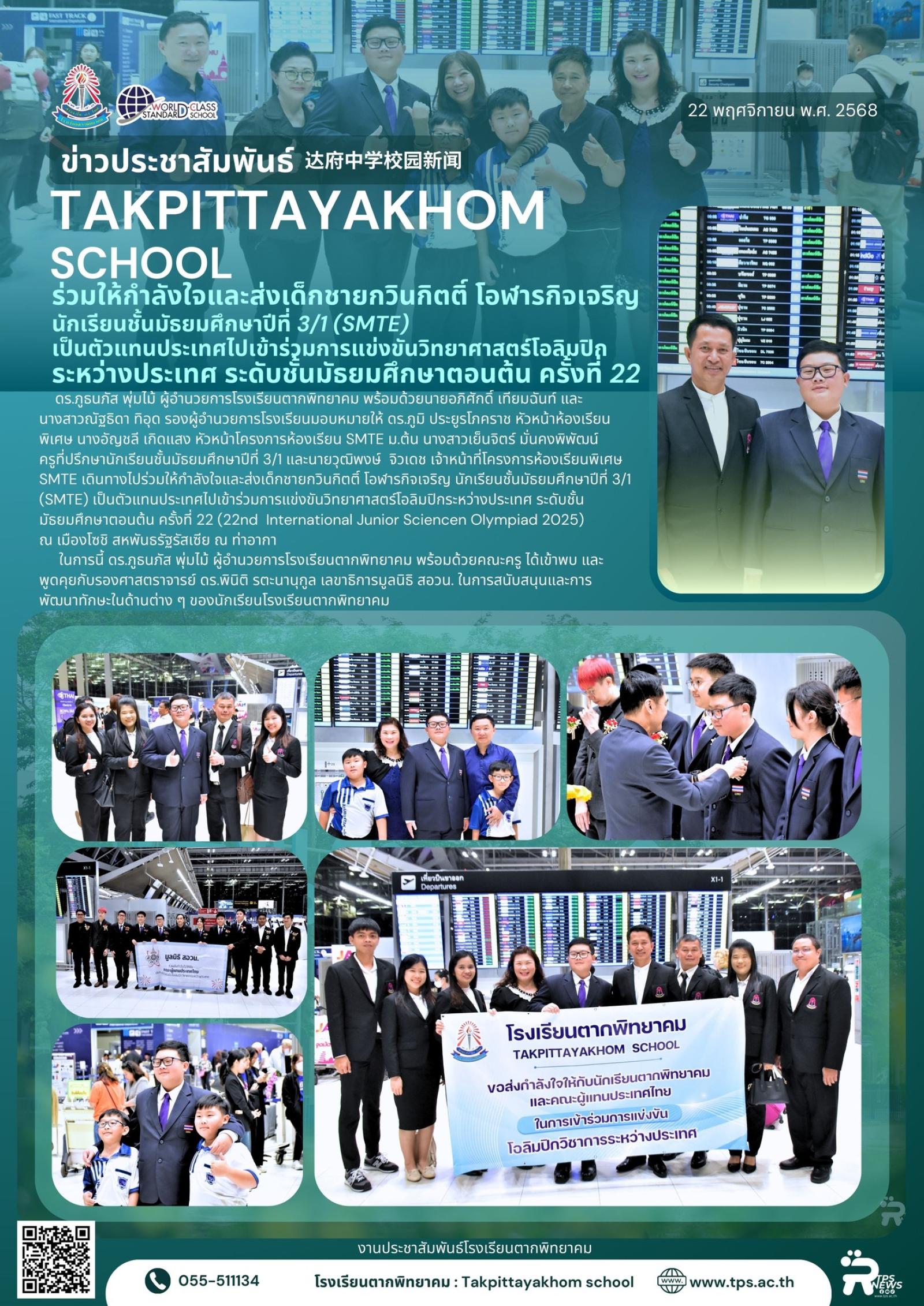 วันที่ 22 พฤศจิกายน พ.ศ. 2568 ดร.ภูธนภัส พุ่มไม้ ผู้อำนวยการโรงเรียนตากพิทยาคม พร้อมด้วยนายอภิศักดิ์ เทียมฉันท์ และนางสาวณัฐธิดา ทิอุด รองผู้อำนวยการโรงเรียนมอบหมายให้ ดร.ภูมิ ประยูรโภคราช หัวหน้าห้องเรียนพิเศษ นางอัญชลี เกิดแสง หัวหน้าโครงการห้องเรียน SMTE ม.ต้น นางสาวเย็นจิตร์ มั่นคงพิพัฒน์ ครูที่ปรึกษานักเรียนชั้นมัธยมศึกษาปีที่ 3/1 และนายวุฒิพงษ์ จิวเดช เจ้าหน้าที่โครงการห้องเรียนพิเศษ SMTE เดินทางไปร่วมให้กำลังใจและส่งเด็กชายกวินกิตติ์ โอฬารกิจเจริญ นักเรียนชั้นมัธยมศึกษาปีที่ 3/1 (SMTE) เป็นตัวแทนประเทศไปเข้าร่วมการแข่งขันวิทยาศาสตร์โอลิมปิกระหว่างประเทศ ระดับชั้นมัธยมศึกษาตอนต้น ครั้งที่ 22 (22nd International Junior Sciencen Olympiad 2025) ณ เมืองโซชิ สหพันธรัฐรัสเซีย ณ ท่าอากา