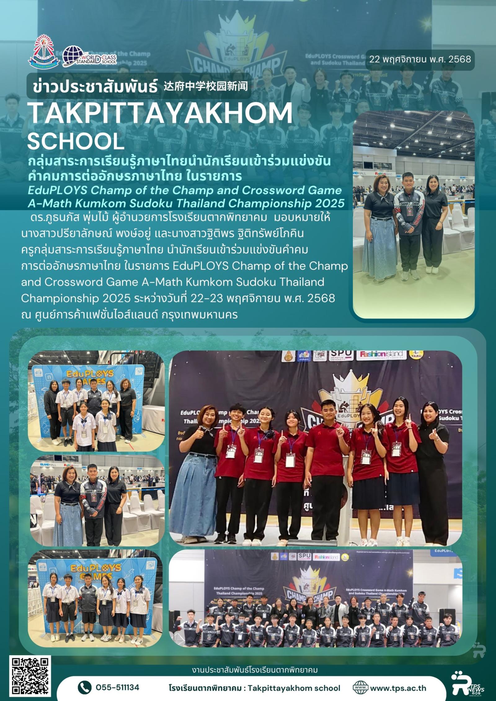 วันที่ 22 พฤศจิกายน พ.ศ. 2568 ดร.ภูธนภัส พุ่มไม้ ผู้อำนวยการโรงเรียนตากพิทยาคม มอบหมายให้นางสาวปรียาลักษณ์ พงษ์อยู่ และนางสาวฐิติพร ฐิติทรัพย์โภคิน ครูกลุ่มสาระการเรียนรู้ภาษาไทย นำนักเรียนเข้าร่วมแข่งขันคำคม การต่ออักษรภาษาไทย ในรายการ EduPLOYS Champ of the Champ and Crossword Game A-Math Kumkom Sudoku Thailand Championship 2025 ระหว่างวันที่ 22-23 พฤศจิกายน พ.ศ. 2568 ณ ศูนย์การค้าแฟชั่นไอส์แลนด์ กรุงเทพมหานคร