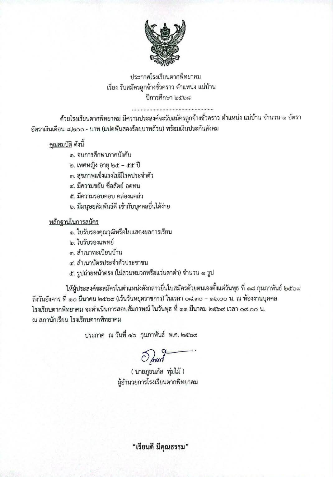 ด้วยโรงเรียนตากพิทยาคม มีความประสงค์จะรับสมัครลูกจ้างชั่วคราว