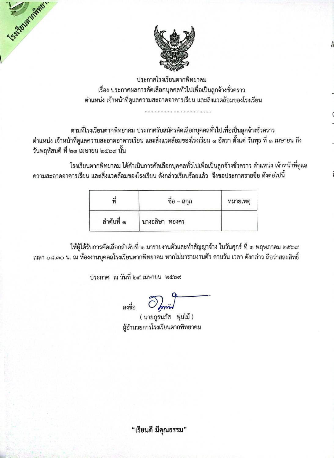 ประกาศผลการคัดเลือกบุคคลทั่วไปเพื่อเป็นลูกจ้างชั่วคราว ตำแหน่ง เจ้าหน้าที่ดูแลความสะอาดอาคารเรียน และสิ่งแวดล้อมของโรงเรียน